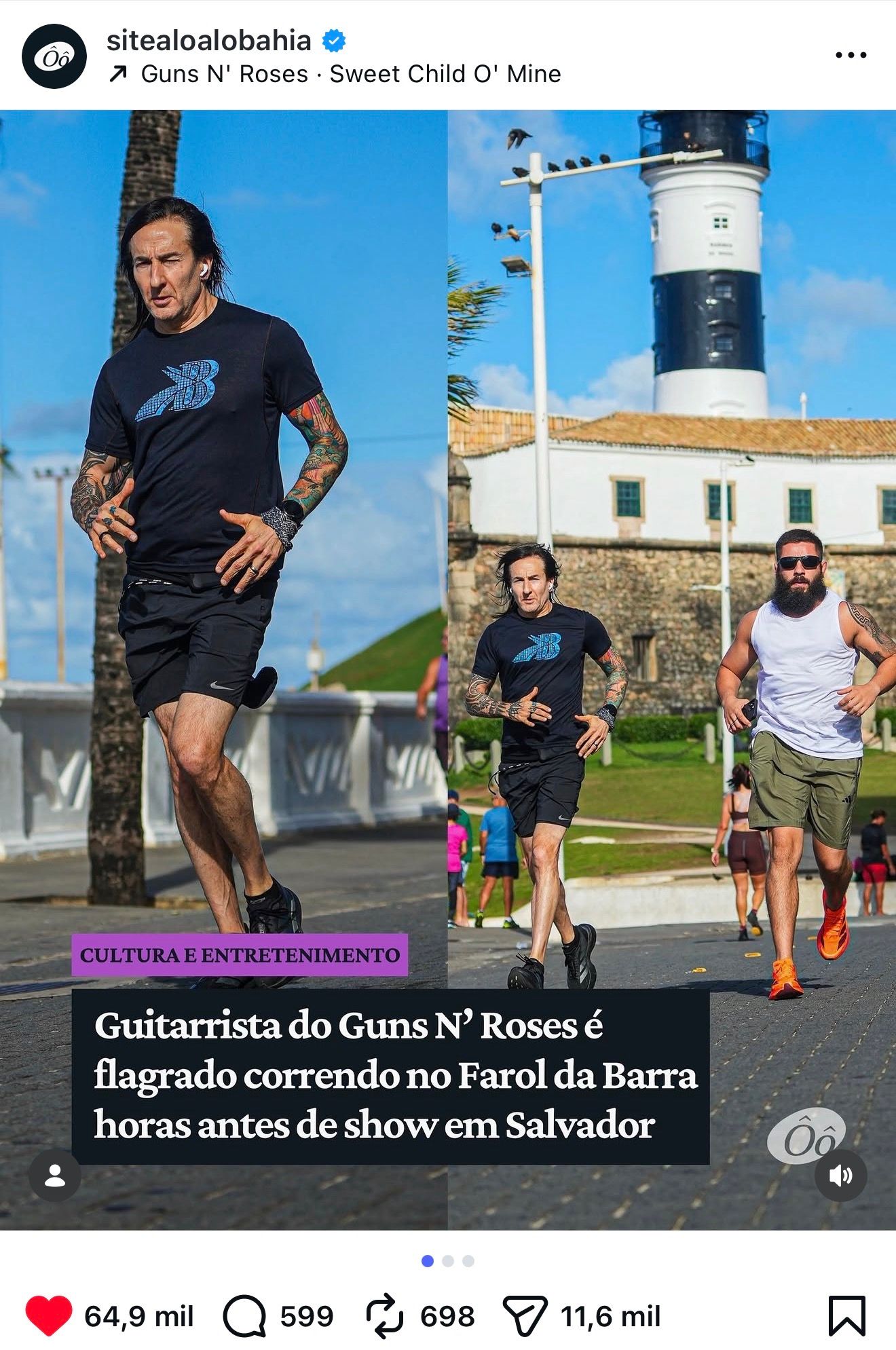 Na última semana, a banda Guns N’ Roses fez história em Salvador ao lotar a Arena Fonte Nova em plena quarta-feira. Horas antes do show, um momento inusitado chamou a atenção nas redes: o guitarrista foi flagrado correndo nas proximidades do Farol da Barra, um dos principais cartões-postais da cidade.